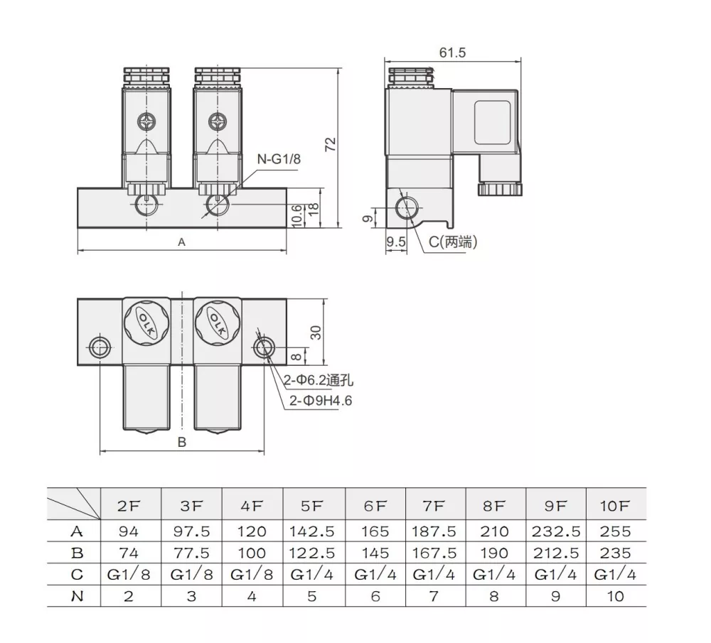 2V025 iki mövqeli, ikitərəfli birbaşa fəaliyyət göstərən normal qapalı solenoid klapan tətbiq tələblərinə uyğun olaraq 2-dən 12 mövqeyə qədər çevik genişlənmə ilə klapan bazası yaratmaq üçün birləşdirilə bilər. Bu çoxstansiyalı 2V025 Solenoid Valf Manifoldu yığcam və yüngül dizayna malikdir, lakin fərdi istifadə üçün sökülə bilməz. Vana gövdəsi yüksək keyfiyyətli alüminium ərintisindən hazırlanmışdır və NBR sızdırmazlıq materialından istifadə edir.