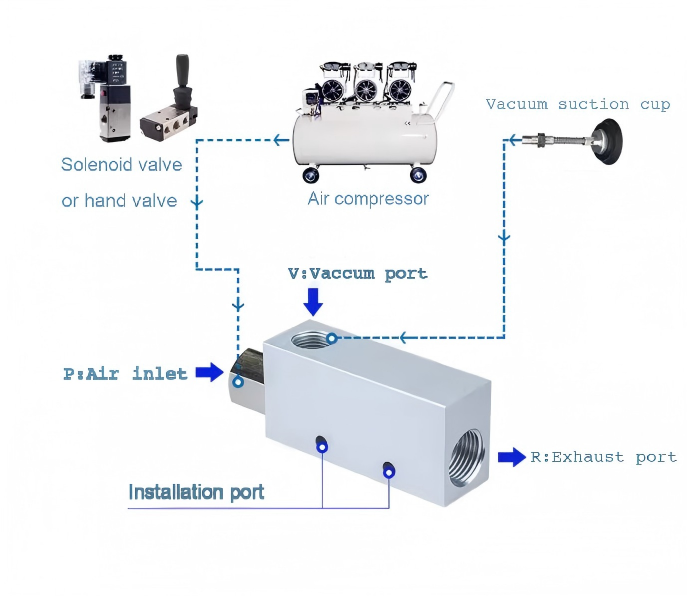 Vakuum generatoru mənfi təzyiq yaratmaq üçün müsbət təzyiqli hava mənbəyindən istifadə edən səmərəli, təmiz, qənaətcil və kiçik vakuum komponentinin yeni növüdür. Bu, sıxılmış hava olan yerlərdə və ya pnevmatik sistemdə həm müsbət, həm də mənfi təzyiqlərin tələb olunduğu yerlərdə mənfi təzyiq əldə etməyi çox asan və rahat edir.