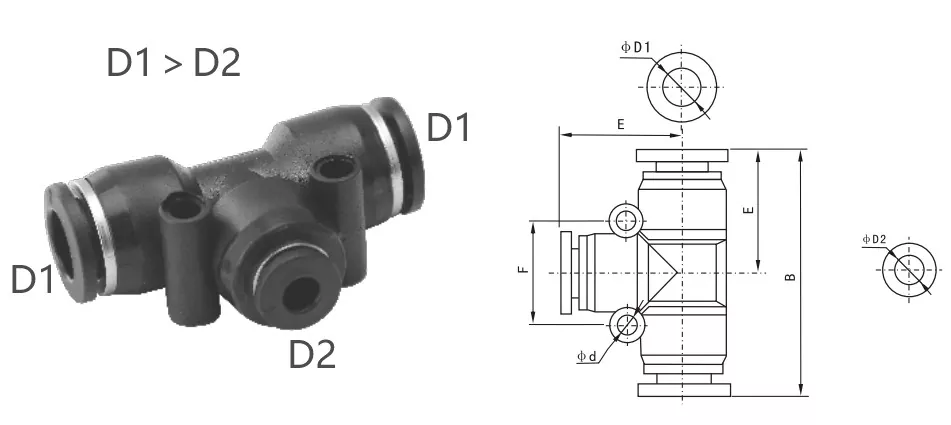 PE uyğun (bərabər tee birliyi): Hər üç boru eyni xarici diametri, eyni ölçülü üç pnevmatik boruya uyğun olan eyni xarici diametrə malikdir.